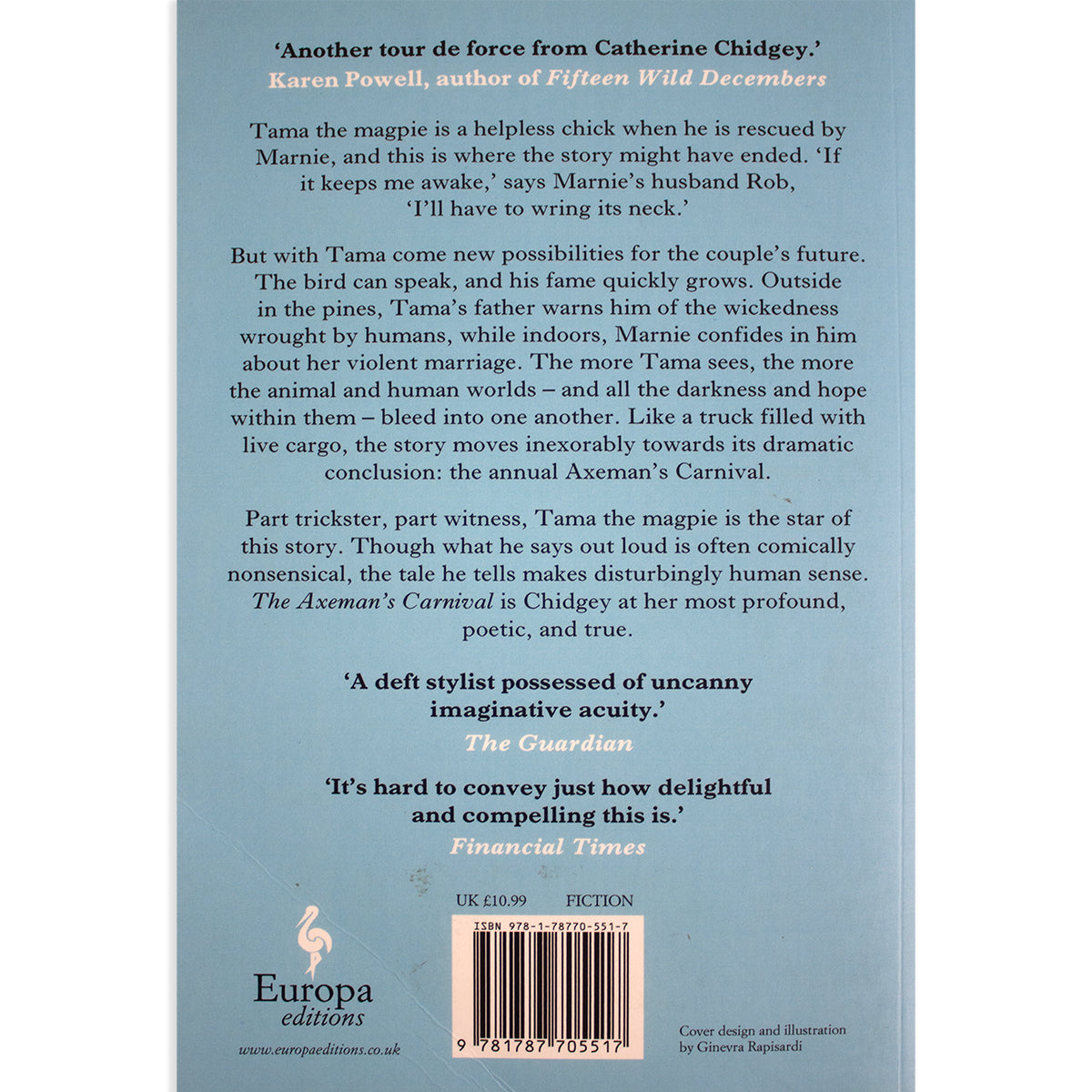 Part trickster, part surrogate child, part witness, Tama the magpie is the star of this story. Though what he says aloud to humans is often nonsensical (and hilarious), the tale he tells us weaves a disturbingly human sense. The Axeman’s Carnival is Catherine Chidgey at her finest—comic, profound, poetic and true.